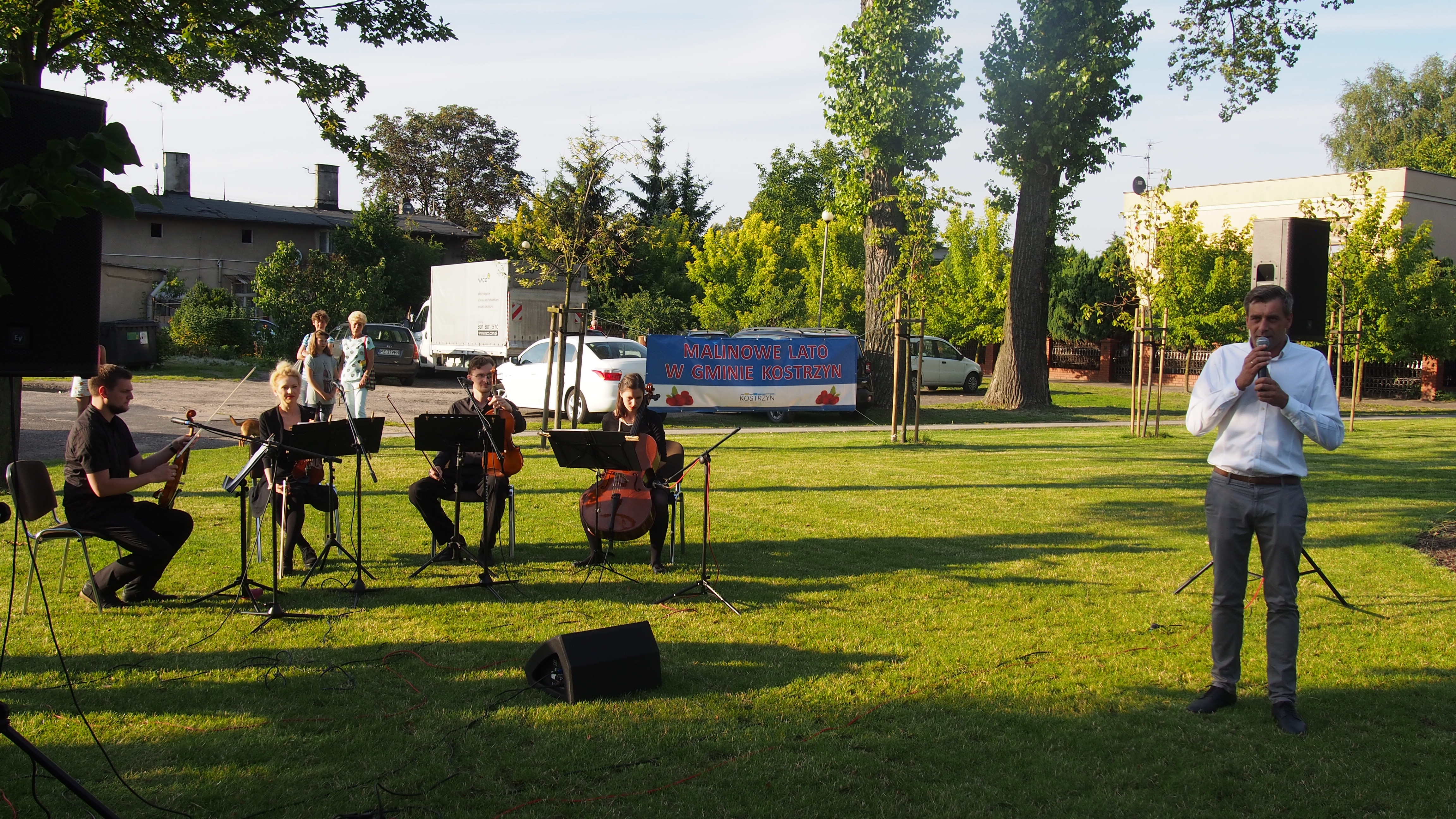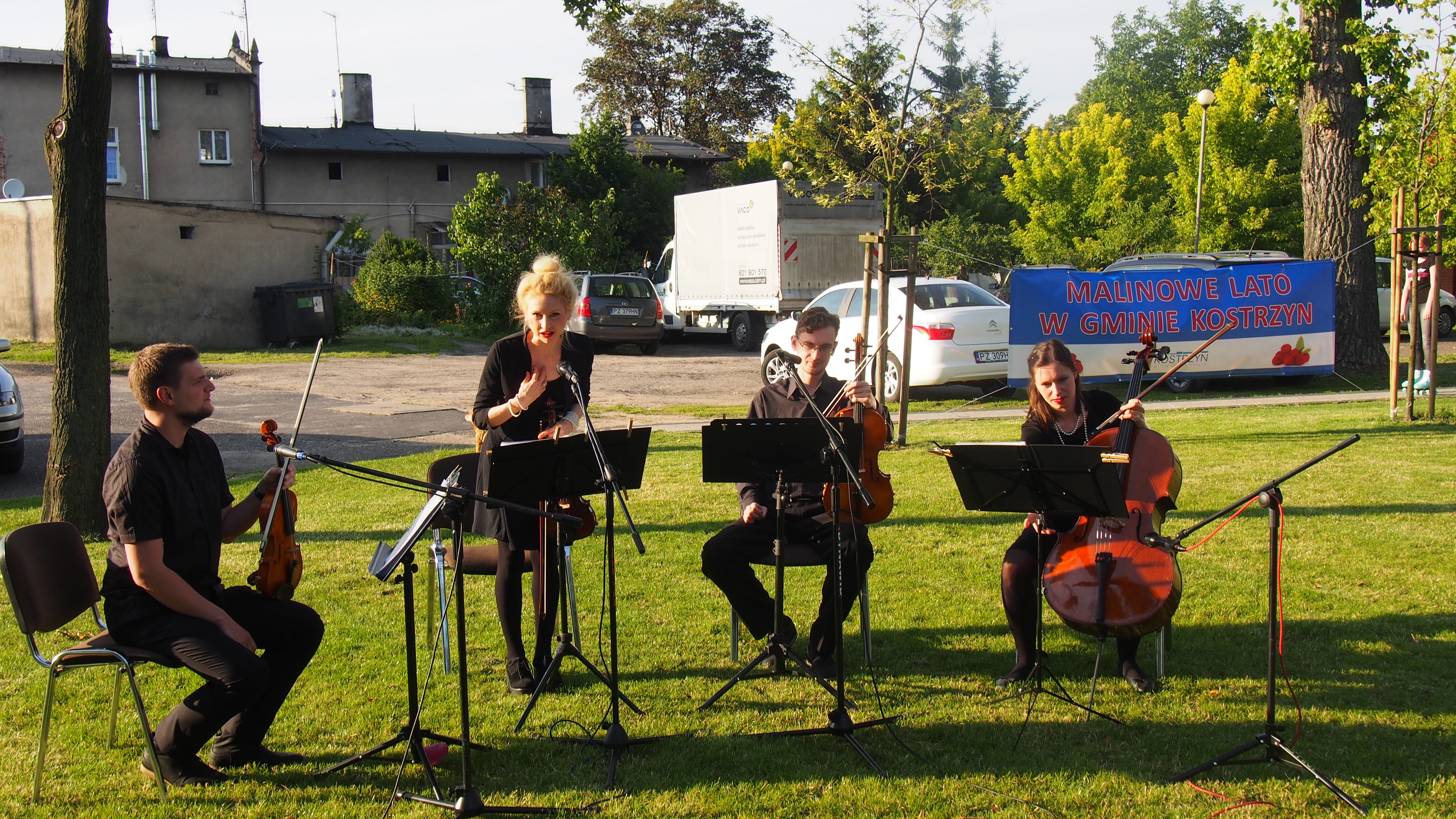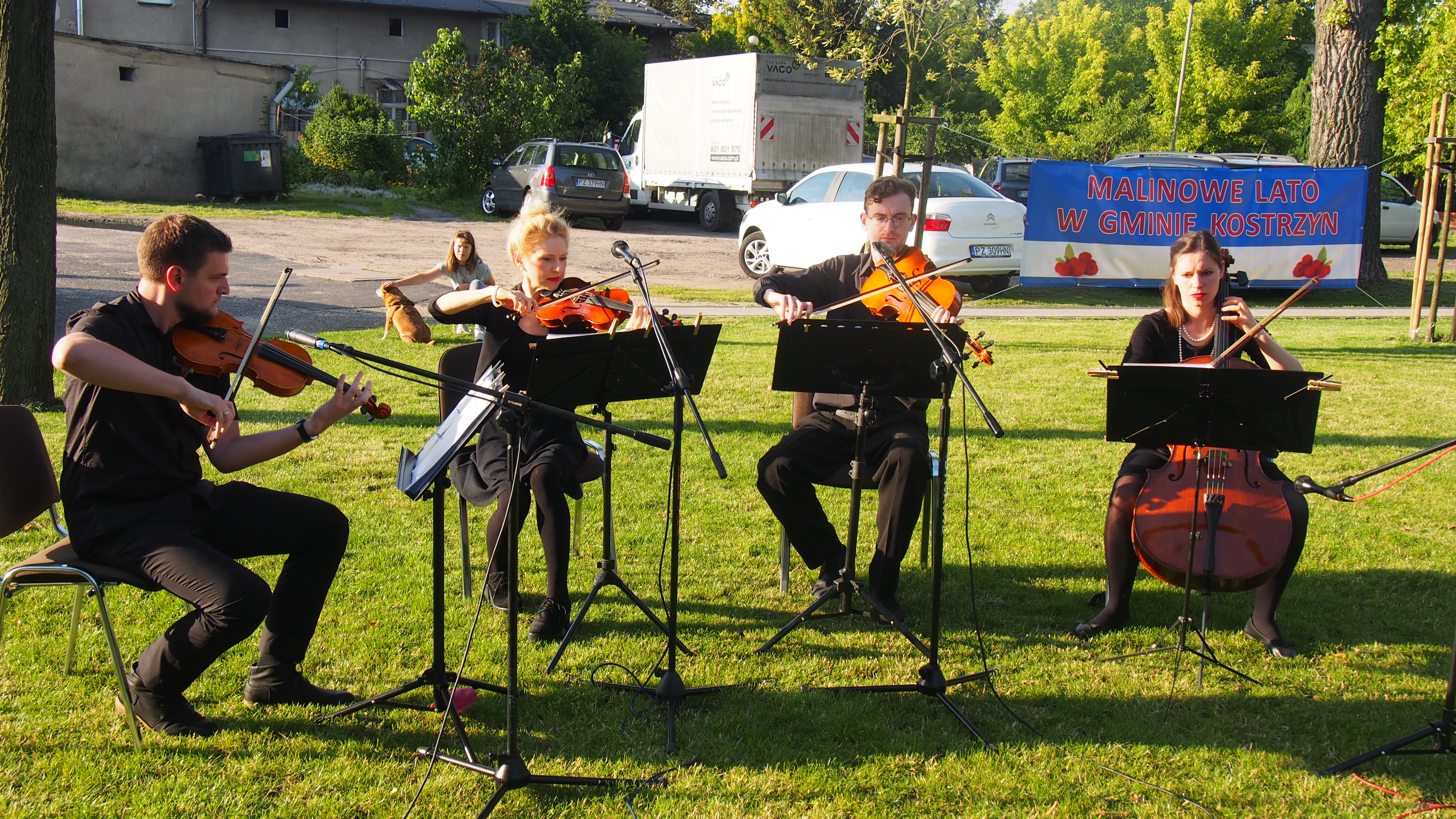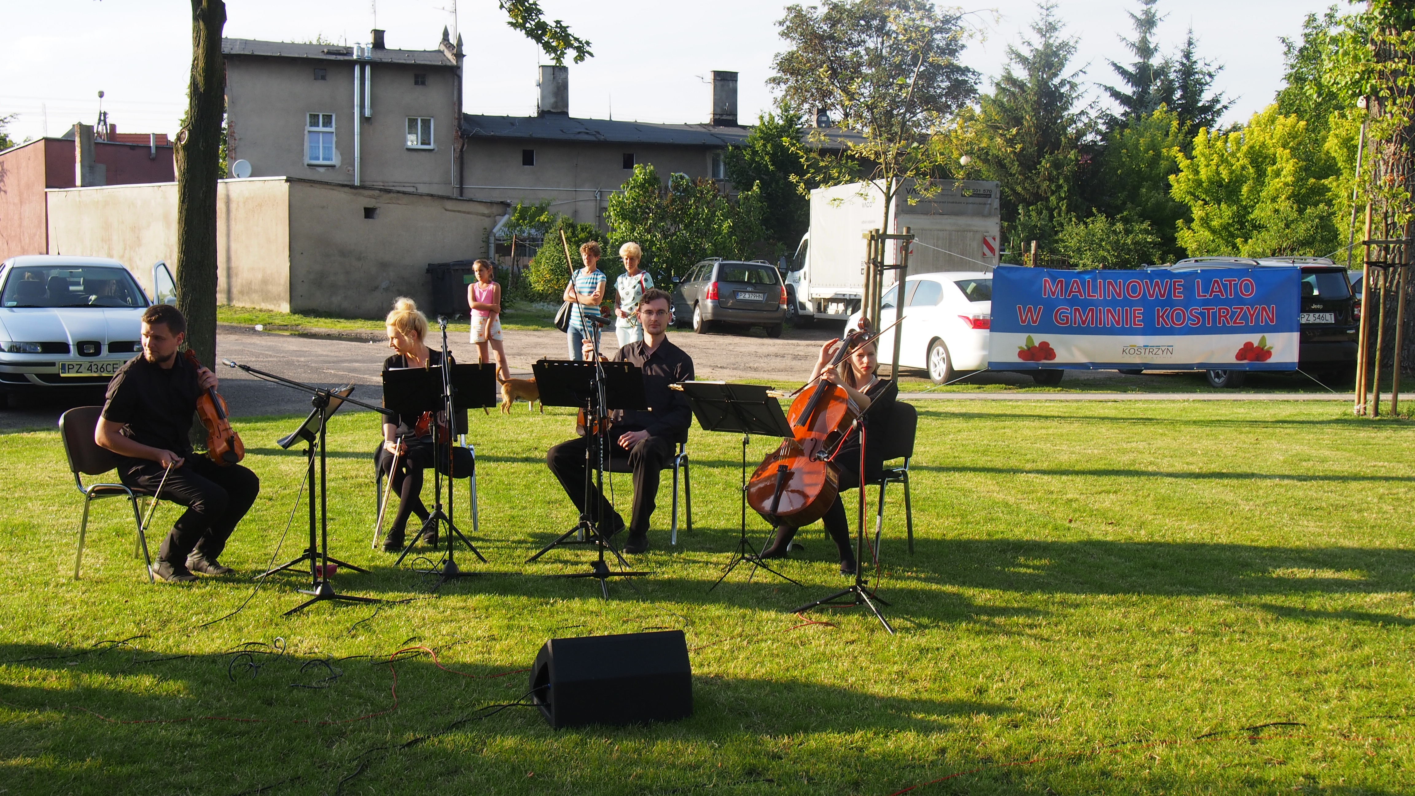 Wczoraj w Kostrzynie w Parku Harcerza odbyła się pierwsza impreza z cyklu Malinowe Lato w Gminie Kostrzyn, organizowana przez Burmistrza Gminy Kostrzyn Szymona Matyska oraz Wydział Oświaty, Promocji i Sportu Urzędu Miejskiego przy współpracy z partnerami: firmami Madar, Scandic Sofa, Motorem, Kopex, Pracownią Fryzjerską Agnieszka Hoffmann, Kostrzyńską Wytwórnią Lodów Tradycyjnych. W ramach spotkania na Mieszkańców czekały animacje dla dzieci oraz koncert kwartetu smyczkowego. Tym razem zabawy dla dzieci upłynęły pod znakiem bańki mydlanej. Wiele radości dzieciom sprawiły ogromne bańki ale na wszystkie dzieci czekały też małe bańki, które można wykonać samodzielnie. Ponadto malowanie buziek i wata cukrowa sprawiły, że na twarzach małych Kostrzynian pojawiał się uśmiech. Chętne osoby mogły nabyć także kawę, herbatę i lody. O godzinie 19.00 rozpoczęła się prawdziwa uczta dla ducha. W otoczeniu natury swój koncert dał kwartet smyczkowy Amabile. W trakcie ponad godzinnego występu muzycy zaprezentowali na skrzypcach i wiolonczeli - jak sami to określali- utwory łatwe, lekkie i przyjemne, znane wszystkim.
