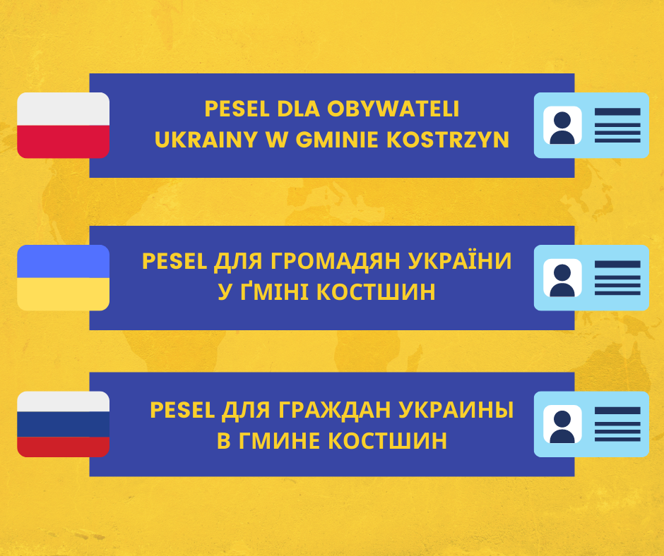 Міська адміністрація у Костшині повідомляє, що з 16.03.2022 розпочинає прийом заяв на присвоєння номерів Pesel для громадян України, які перетнули кордон Польщі після 24.02.2022.