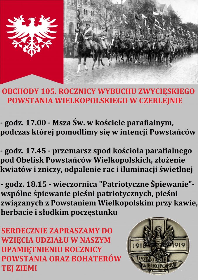 Serdecznie zapraszamy na Wieczornicę z okazji 105. Rocznicy Wybuchu Zwycięskiego Powstania Wielkopolskiego "Patriotyczne Śpiewanie", która odbędzie się 27 grudnia 2023 r. w Świetlicy Wiejskiej w Czerlejnie. Początek o 18:15. Serdecznie zapraszamy w imieniu organizatorów.