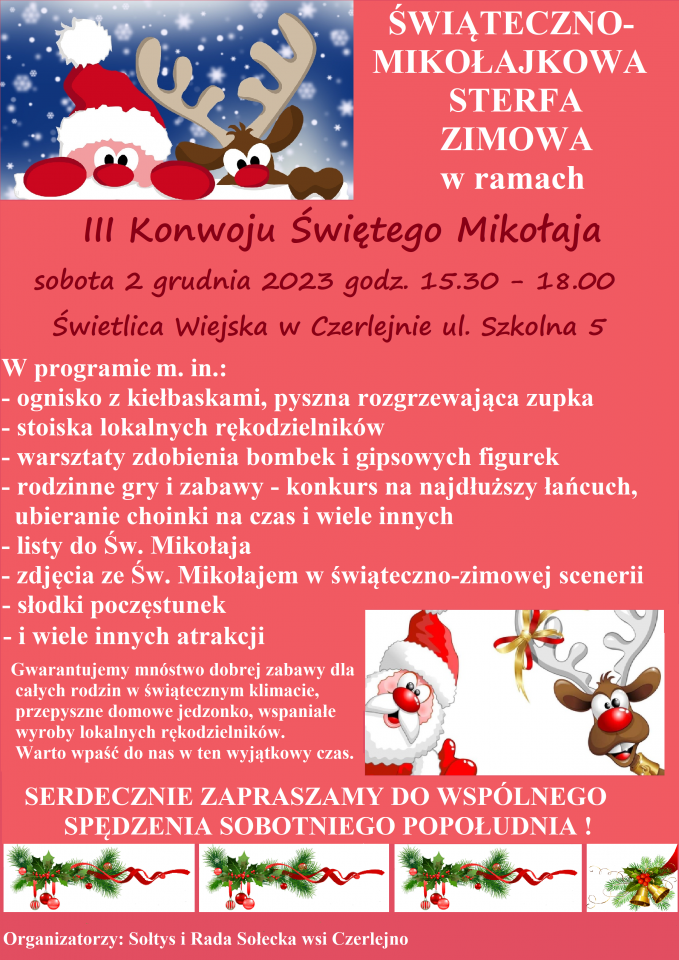 Sołtys i Rada Sołecka wsi Czerlejno serdecznie zaprasza wszystkich mieszkańców na „ŚWIĄTECZNO-MIKOŁAJKOWĄ STREFĘ ZIMOWĄ”, która zagości w dniu 2 grudnia 2023 roku (sobota) od godz. 15.30 na terenie przy Świetlicy Wiejskiej w Czerlejnie. Na przybyłych małych i dużych czekać będzie moc rozmaitych atrakcji w świąteczno-zimowej scenerii. Nie zabraknie przepysznego jedzenia i wypieków oraz ogniska z kiełbaskami, kolorowej karuzeli dla najmłodszych. Swoje wyroby zaprezentują na kolorowych stoiskach lokalni rękodzielnicy, a rodziny będą mogły spróbować swoich sił w świątecznych konkurencjach jak ubieranie choinki na czas czy w robieniu najdłuższego łańcucha choinkowego. Dla dzieci przygotowana zostanie specjalna strefa warsztatowa, na której będą mogły własnoręcznie wykonać bombkę czy ozdobić gipsowe figurki. Dla chętnych będzie również możliwość napisania listu do Świętego Mikołaja czy zrobienia pamiątkowego zdjęcia w saniach Mikołaja. Gwarantujemy mnóstwo dobrej zabawy i pozytywnej energii. Zapraszamy do miłego spędzenia z nami sobotniego popołudnia.
